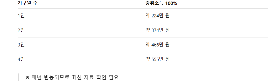 - 또한 소득이 중위소득 100% 이하(2025년 기준 3인 가구 약 466만 원 이하)여야 합니다.