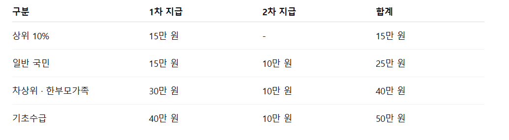 소득이나 가구 상황에 따라 지원금이 조금씩 달라집니다. 아래 표를 보면 한눈에 딱 정리돼요.